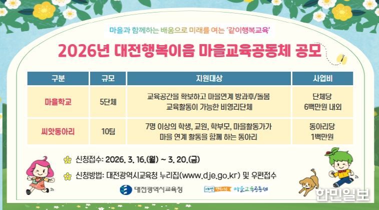 한민일보 서울포커스 유한희 기자 | 대전시교육청은 마을과 학교가 협력하는 교육생태계 조성을 위해 ‘2026년 마을교육공동체 마을학교 및 씨앗동아리’를 공모한다고 밝혔다.