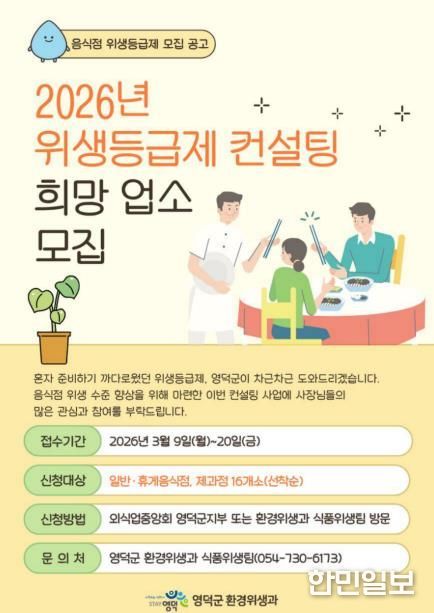 한민일보 서울포커스 임경복 기자 | 영덕군은 지역 음식점의 위생 수준을 높이고 외식 환경의 경쟁력을 강화하기 위해 올해 ‘음식점 위생 등급제 컨설팅’ 사업에 참여 업소를 오는 9일부터 20일까지 선착순으로 모집한다.