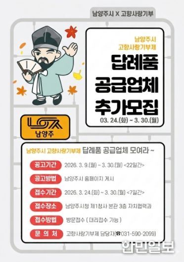 한민일보 서울포커스 김성윤 기자 | 남양주시는 오는 3월 24일부터 고향사랑기부제 참여자들에게 제공할 ‘2026년 고향사랑기부제 답례품 공급업체’ 추가 모집 접수를 시작한다고 6일 밝혔다.