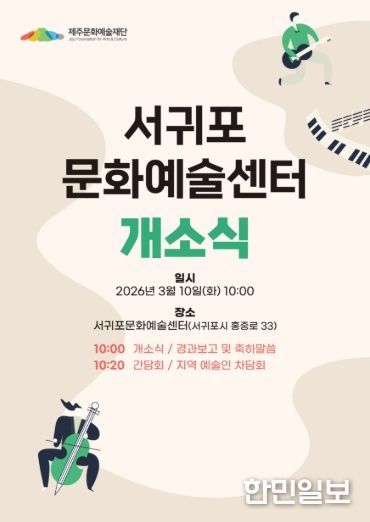 한민일보 서울포커스 임경복 기자 | 제주문화예술재단은 오는 3월 10일 오전 10시 서귀포문화예술센터(서귀포시 홍중로 33)에서 개소식을 개최한다. 재단은 이번 개소를 계기로 산남지역 문화예술 지원 기능을 전담하는 거점 체계를 본격 운영할 계획이다.