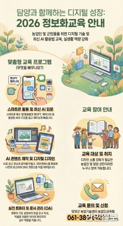 한민일보 서울포커스 임철현 기자 | 담양군은 지역 농업인의 디지털 소통 능력을 키우고 스마트한 농촌 환경을 조성하기 위해 ‘2026년 농업인 정보화 교육’을 추진한다.