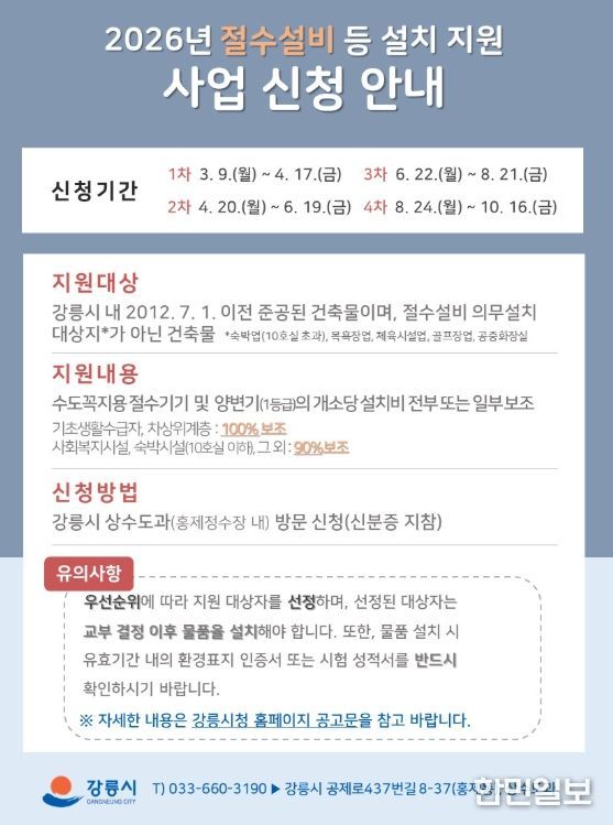 한민일보 서울포커스 임경복 기자 | 강릉시는 지속되는 기상이변과 장기 갈수기(가뭄 때)로 원수 확보가 어려워짐에 따라, 시민들이 수돗물을 절약하고 효율적으로 사용할 수 있도록 ‘2026년 절수설비 등 설치 지원사업’을 추진한다.