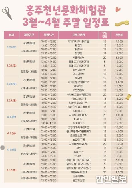 한민일보 서울포커스 유돈상 기자 | 홍성군 홍주천년문화체험관은 다가오는 봄을 맞아 오는 21일부터 4월 26일까지 매주 주말마다 다채로운 주말 체험 프로그램을 운영한다고 밝혔다.