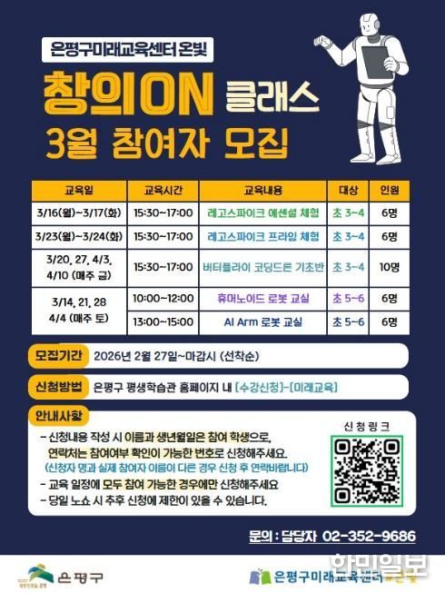 한민일보 서울포커스 임광현 기자 | 서울 은평구는 은평구미래교육센터 온빛에서 초등학생을 대상으로 한 체험형 AI 창의융합 교육 프로그램 ‘창의ON 클래스’ 참여자를 모집한다고 밝혔다.