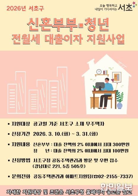 한민일보 서울포커스 곽중희 기자 | 서울 서초구가 가파른 대출 금리 인상과 주거비 부담으로 어려움을 겪고 있는 무주택 신혼부부와 청년들에게 ‘2026년 전월세 보증금 대출이자 지원사업’을 시행한다고 밝혔다. 전월세 보증금 대출이자 지원사업은 경제적 자립 기반이 약한 무주택자 신혼부부와 청년들의 안정적인 정착을 돕기 위해 전월세 보증금 대출이자를 신혼부부에게는 연 300만 원, 청년에게는 연 100만 원까지 지원하는 사업이다.