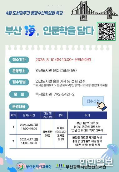 박호경 연산도서관장은 “부산 바다를 배경으로 한 이번 특강이 지역 주민들에게 차별화된 해역 인문학을 이해하는 뜻깊은 시간이 되길 기대한다”고 밝혔다.