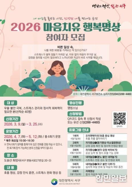 한민일보 서울포커스 임경복 기자 | 대전 서구는 바쁜 일상과 스트레스로 지친 구민들의 마음 건강 회복을 위한 ‘마음치유 행복명상’ 참여자를 모집한다고 9일 밝혔다.