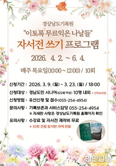 한민일보 서울포커스 임경복 기자 | 경상남도기록원은 9일부터 23일까지 ‘이토록 무르익은 나날들 – 시니어 자서전 쓰기’ 프로그램 참여자를 모집한다고 밝혔다.