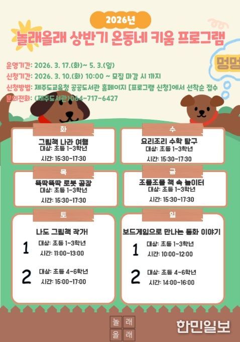 한민일보 서울포커스 임경복 기자 | 제주도교육청 제주도서관은 도내 초등학생들의 알찬 방과 후와 주말 활동을 지원하기 위해 2026년 상반기 주중·주말 온동네 키움 프로그램’을 본격 운영한다.