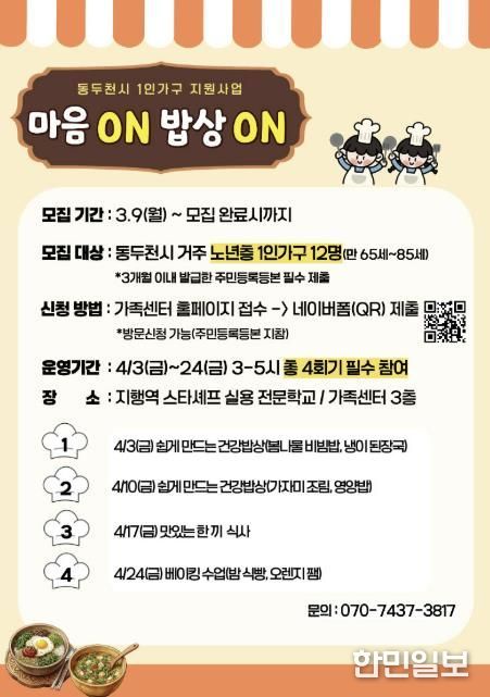 한민일보 서울포커스 임경복 기자 | 동두천시가족센터는 동두천시에 거주하는 1인 가구를 대상으로 “1인 가구 식생활 개선 다이닝 – 마음 ON 밥상 ON” 프로그램 참여자를 모집한다.