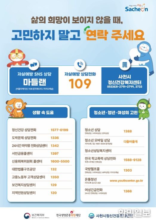 한민일보 서울포커스 김은금 기자 | 사천시정신건강복지센터는 자살률이 급증하는 봄철(3~5월)을 맞아, 자살 고위험군을 집중적으로 관리하고 생명 존중 문화를 확산하기 위한 집중 홍보 활동에 나선다고 9일 밝혔다.