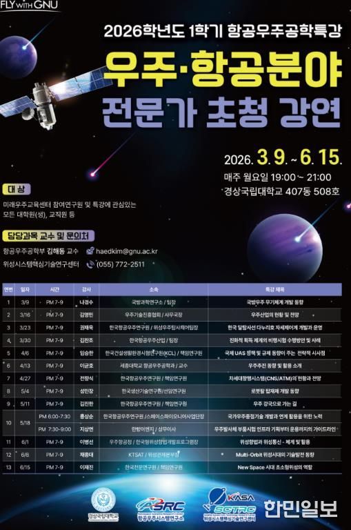 한민일보 서울포커스 박근원 기자 | 경상국립대학교 위성시스템핵심기술연구센터는 3월 9일부터 6월 15일까지 13차례에 걸쳐 우주‧항공 분야 전문가 초청강연을 진행한다.