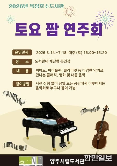 한민일보 서울포커스 임경복 기자 | 양주시 옥정호수도서관이 오는 3월 14일부터 7월 18일까지 시민들이 일상 속에서 음악을 즐길 수 있도록 ‘토요 짬 연주회’를 진행한다.