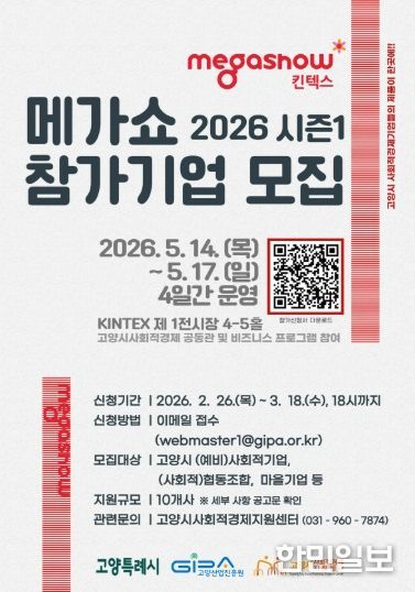한민일보 서울포커스 김은금 기자 | 고양산업진흥원 고양시사회적경제지원센터가 고양시 사회적경제기업의 판로 확대와 경쟁력 강화를 위해 ‘메가쇼 2026 시즌1’참가기업을 모집한다.