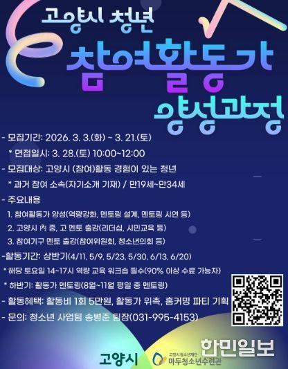 한민일보 서울포커스 김은금 기자 | 고양시청소년재단 마두청소년수련관은 고양시에서 다양한 참여 활동을 경험한 청년들을 전문적인 역량을 갖춘 멘토로 육성하는 ‘2026 고양시 청년참여활동가 양성과정’ 참가자를 모집한다.