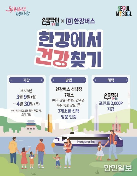 서울시는 9일부터 4월 30일까지 대표 건강 앱 ‘손목닥터9988’과 신규 교통수단 ‘한강버스’를 연계한 '한강에서 건강찾기' 챌린지를 운영한다.