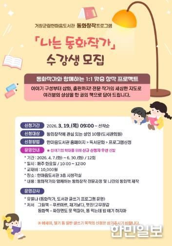 한민일보 서울포커스 김서윤 기자 | 거창군은 한마음도서관에서 오는 19일부터 성인을 대상으로 창작의 기쁨을 선사하는 글쓰기 교육 프로그램 ‘나는 동화작가’ 참가자를 모집한다고 밝혔다.