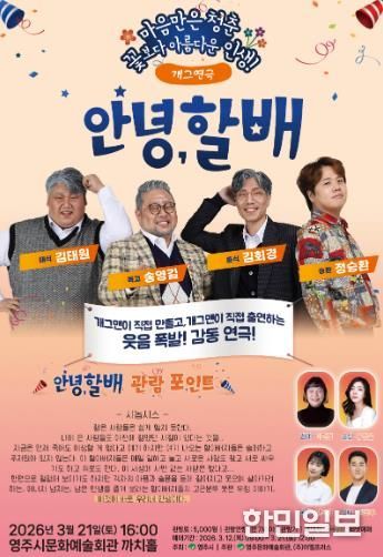 영주시문화예술회관 관계자는 “이번 ‘안녕, 할배’는 부모님을 위한 최고의 효도 공연이자 온 가족이 함께 즐길 수 있는 주말 나들이가 될 것”이라며 “따뜻한 봄날, 까치홀에서 마음껏 웃으며 일상의 스트레스를 날려버리시길 바란다”고 전했다.