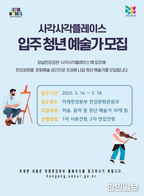 한민일보 서울포커스 국용호 기자 | 서울시는 올해 잠실한강공원 내 ‘사각사각플레이스’에 입주해 예술활동을 펼치며 한강공원을 일상 속 문화공간으로 조성해 나갈 청년 예술가 10개 팀을 신규 모집한다.