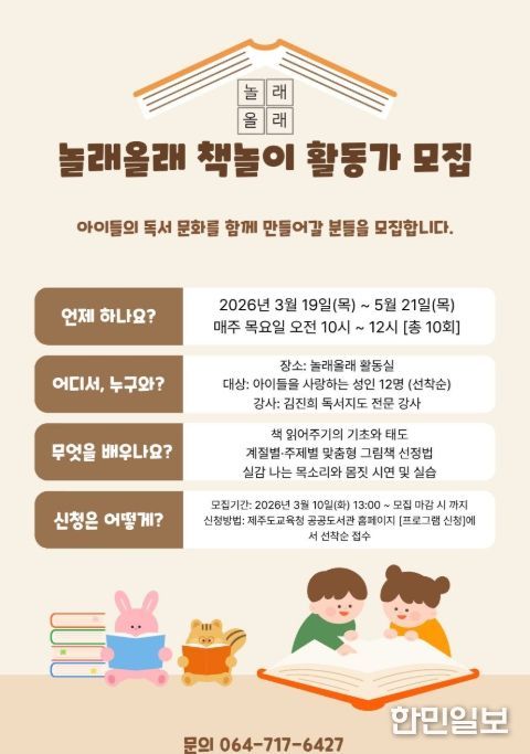 한민일보 서울포커스 임경복 기자 | 제주도교육청 제주도서관은 19일부터 성인을 대상으로 전문적인 책놀이 활동가 양성을 위한 ‘놀래올래 책놀이 활동가 교육’ 프로그램을 운영한다.