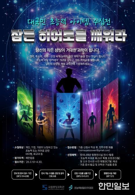 한민일보 서울포커스 기자 | 미래의 꿈을 만드는 과학 기술 문화 이음터(플랫폼) 과학기술정보통신부 국립중앙과학관은 창의 나래관 신규 전시관 개관을 앞두고, 대국민 참여형 전시인 ‘초능력 품목(아이템) 수집전: 잠든 영웅(히어로)을 깨워라’를 3월 10일부터 시작한다고 밝혔다.