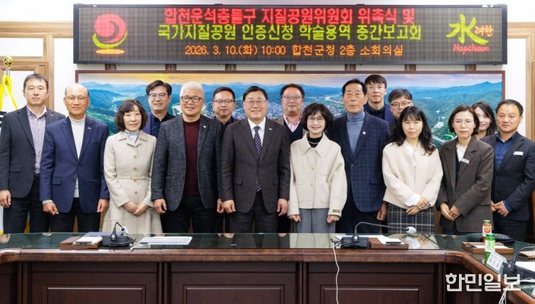 한민일보 서울포커스 김은금 기자 | 합천군은 10일 군청 2층 소회의실에서 ‘합천운석충돌구 지질공원위원회 위촉식’과 ‘합천 국가지질공원 타당성·기초학술조사 및 인증신청 학술용역 중간보고회’를 개최했다.