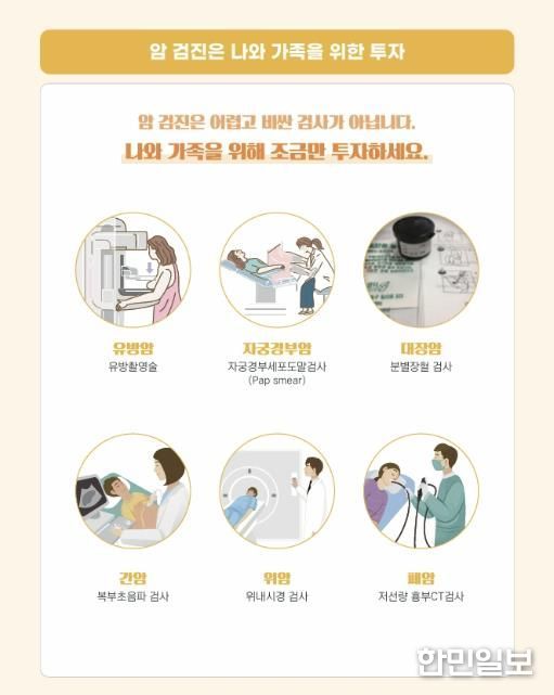 국가암검진 대상 암종과 기준은 ▲위암(40세 이상 남녀, 2년마다 위내시경 검사) ▲간암(40세 이상 고위험군, 6개월마다 간초음파 및 혈액검사) ▲대장암(50세 이상 남녀, 매년 분변잠혈검사) ▲유방암(40세 이상 여성, 2년마다 유방촬영술) ▲자궁경부암(20세 이상 여성, 2년마다 자궁경부세포검사) ▲폐암(54~74세 고위험군, 2년마다 저선량 흉부 CT) 등이다.