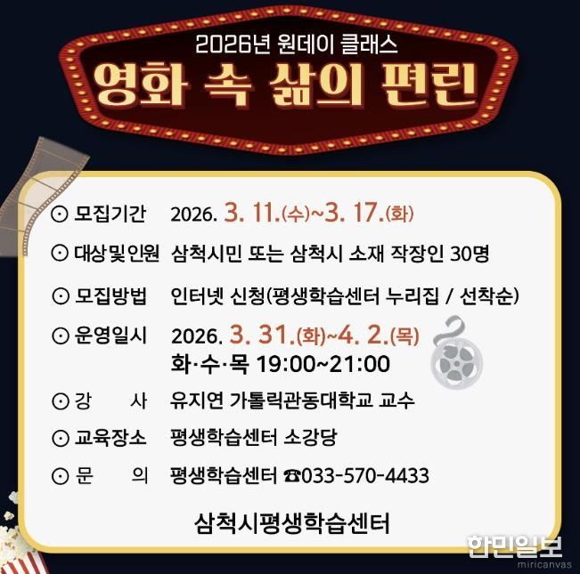 한민일보 서울포커스 임경복 기자 | 삼척시는 3월 31일부터 4월 2일까지 삼척시민 또는 관내 직장인을 대상으로 2026년 원데이 클래스 '영화 속 삶의 편린' 수강생을 모집한다고 밝혔다.