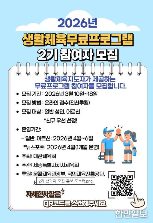 한민일보 서울포커스 임경복 기자 | 세종특별자치시체육회는 시민들의 건강 증진과 생활체육 활성화를 위해 9개 종목 41개 프로그램으로 구성된 「2026년 생활체육 무료프로그램 2기」 참가자를 모집한다고 밝혔다.