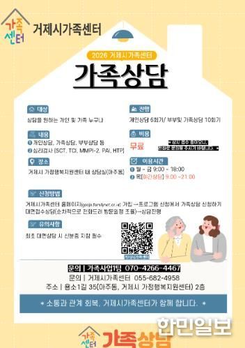 한민일보 서울포커스 김은금 기자 | 거제시가족센터는 생애주기에 따라 나타나는 가족 내 다양한 갈등과 문제 해결을 지원하기 위해 개인상담, 부부상담, 가족상담, 부모-자녀상담, 집단상담 등을 운영하고 참여자를 상시 모집한다고 밝혔다.