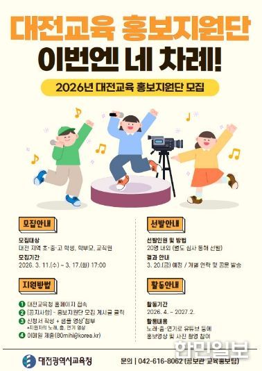 한민일보 서울포커스 유한희 기자 | 대전시교육청은 교육가족이 직접 참여하는 홍보 콘텐츠 제작을 위해 3월 11일부터 17일까지 ‘2026년 대전교육청 홍보지원단’을 공개 모집한다고 밝혔다.