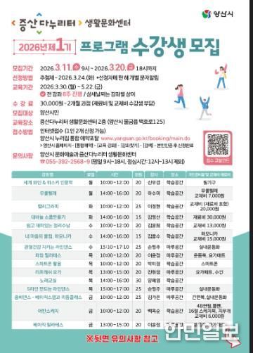 한민일보 서울포커스 김은금 기자 | 양산시는 오는 3월 11일부터 20일까지 10일간 ‘2026년 제1기 증산다누리터 생활문화센터’시민 문화강좌 수강생을 모집한다.
