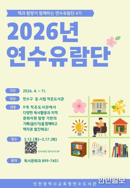 한민일보 서울포커스 유창렬 기자 | 인천광역시교육청연수도서관은 12일부터 연수구 소재 작은도서관을 대상으로 지역 연계 프로그램인 ‘연수유람단’ 참여기관을 모집한다.