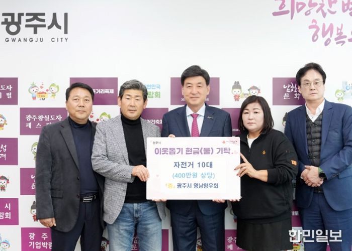 한민일보 서울포커스 임경복 기자 | 광주시 영남향우회는 11일 개인 자전거를 마련하기 어려운 이웃을 위해 자전거 10대(400만 원 상당)를 광주시에 기탁했다.