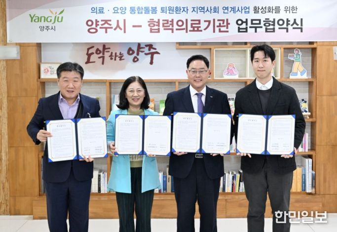 한민일보 서울포커스 임경복 기자 | 양주시는 11일 시장실에서 양주예쓰병원, 경기도의료원 의정부병원과 퇴원환자의 안정적인 지역사회 정착과 원활한 사회 복귀를 지원하기 위해 ‘퇴원환자 지역사회 연계 업무협약’을 체결했다.