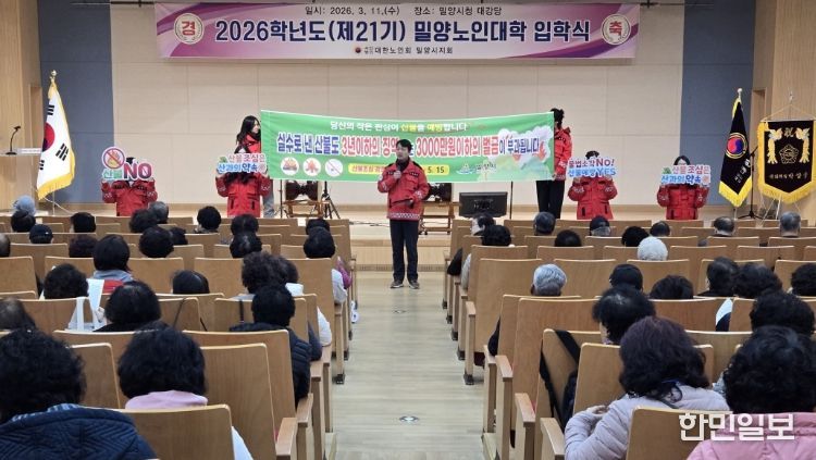 한민일보 서울포커스 김은금 기자 | 경남 밀양시는 11일 밀양시청 대강당에서 열린 ‘제21기 밀양노인대학 입학식’ 현장을 찾아 어르신 및 방문객을 대상으로 봄철 산불 예방 홍보활동을 펼쳤다.