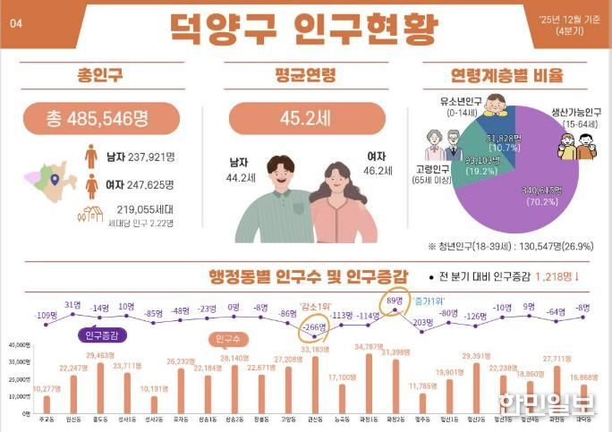 행정동별로 인구규모와 연령구조, 세대 구성, 인구 증감 양상도 서로 다르게 나타났다. 일산동구 장항1동과 덕양구 대덕·효자동은 청년·신혼부부 유입으로 비교적 젊은 인구구조를 보이는 반면, 덕양구 관산·주교동과 일산동구 고봉동은 고령인구 비중이 높아 돌봄·의료·복지 수요가 빠르게 증가하는 등 지역 간 인구구조 격차가 확대되고 있다.