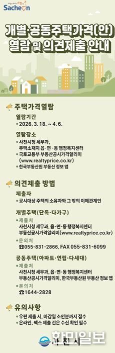 한민일보 서울포커스 김은금 기자 | 사천시는 올해 1월 1일 기준 개별주택과 공동주택에 대하여 주택가격(안) 열람 및 의견제출 기간을 운영한다고 12일 밝혔다.