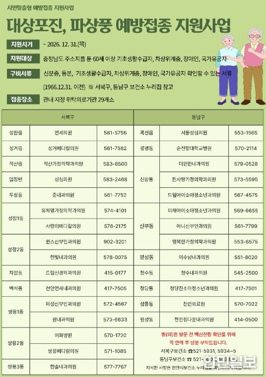 충남도에 주소를 둔 도민이면 내달 1일부터 천안시 서북구·동남구보건소 및 관내 위탁의료기관에서 무료로 예방접종을 받을 수 있다.