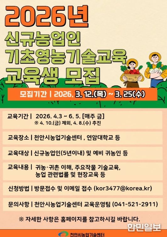 한민일보 서울포커스 황준형 기자 | 천안시농업기술센터는 오는 25일까지 ‘상반기 신규농업인 기초영농기술교육’ 참여자를 모집한다고 13일 밝혔다.