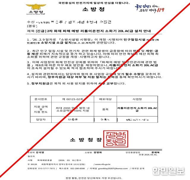 서산소방서에 따르면 일부 업체 또는 개인이 소방청 명의의 공문 형태로 제작된 안내문을 이용해 사업장 등을 대상으로 ‘리튬이온전지 소화기 설치 안내’라며 접근해 물품 구매 또는 비용 지급을 유도하려한 정황이 확인됐다.
