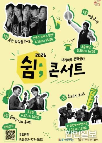 한민일보 서울포커스 백진욱 기자 | (재)인천중구문화재단은 오는 4월부터 7월까지 ‘내리마루 문화쉼터’ 햇살마루에서 월간 공연 프로그램인 '쉼; 콘서트'를 개최한다고 밝혔다.