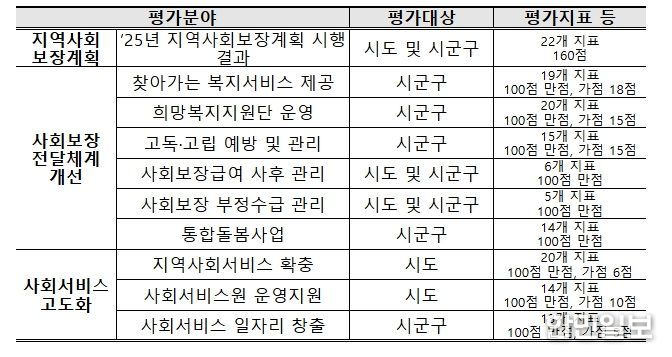 또한 '찾아가는 보건복지서비스 제공' 분야에서는 지자체 사회복지 담당 공무원의 업무환경 개선 노력에 대한 배점이 확대되는 한편, '고독·고립 예방 및 관리' 분야에서는 지난달부터 본격적으로 운영하고 있는 고독사위기대응시스템을 통한 발굴조사 지표 관련 배점을 확대할 예정이다.