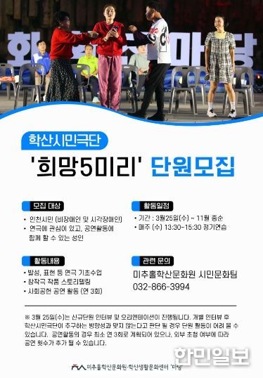 한민일보 서울포커스 백진욱 기자 | 인천 미추홀구 미추홀학산문화원은 위탁 운영하는 학산 생활문화센터는 오는 24일까지 2026년 학산 시민극단 ‘희망5미리’의 단원을 모집한다고 밝혔다.