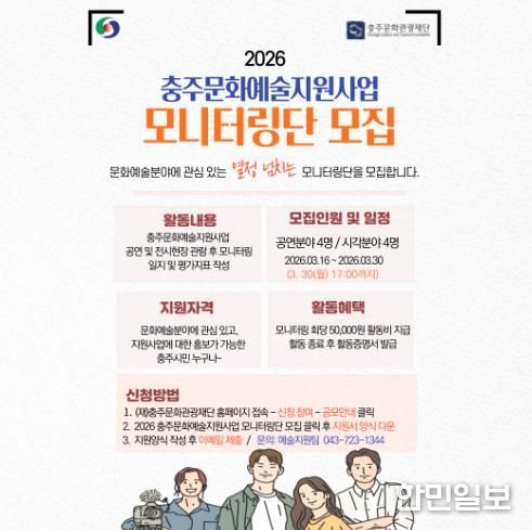 한민일보 서울포커스 김다남 기자 | (재)충주문화관광재단은 오는 30일까지 시민과 함께하는 소통 문화 확산을 위해 ‘2026 충주문화예술지원사업 시민 모니터링단’을 공개 모집한다고 밝혔다.