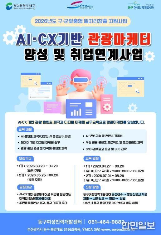 한민일보 서울포커스 임광현 기자 | 부산 동구와 서구가 협력하여 추진한 ‘AI·CX 기반 관광마케터 양성 및 취업 연계 사업’이 지난 3월 6일 부산시 구·군 맞춤형 일자리 창출 추진 공모사업에 최종 선정됐다.