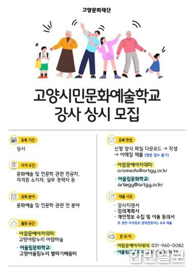 한민일보 서울포커스 김은금 기자 | 고양문화재단은 시민들에게 참신하고 수준 높은 문화예술교육 서비스를 제공하기 위해 ‘고양시민문화예술학교’(아람문예아카데미 및 어울림문화학교) 강사 인력풀(POOL)을 상시 모집한다.