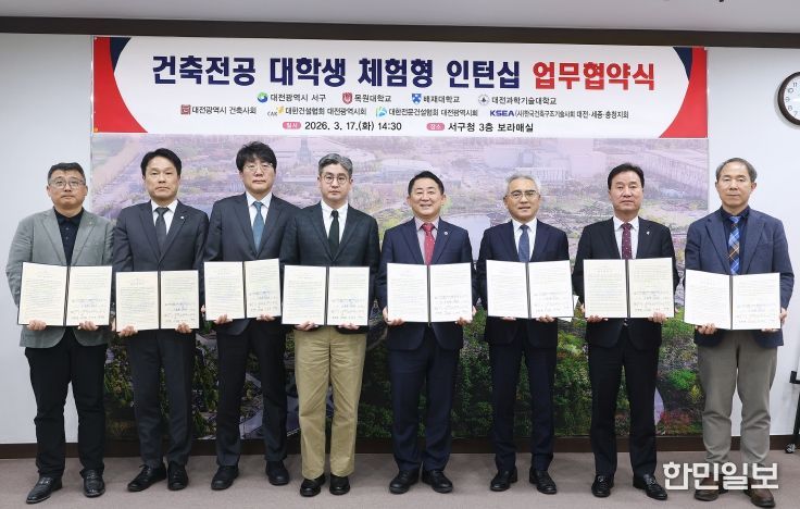 서구는 17일 구청 보라매실에서 목원대학교, 배재대학교, 대전과학기술대학교를 비롯해 대전광역시 건축사회, 대한건설협회 대전광역시회, 대한전문건설협회 대전광역시회, (사)한국건축구조기술사회 대전·세종·충청지회와 함께 ‘지역 건축 인재 채용 활성화를 위한 건축 전공 대학생 직업 체험형 인턴십 프로그램 업무협약’을 체결했다.