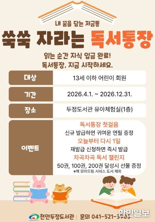 한민일보 서울포커스 황준형 기자 | 천안시 두정도서관은 내달부터 어린이들의 독서습관 형성을 위한‘쑥쑥 자라는 독서통장’프로그램을 운영한다고 18일 밝혔다.