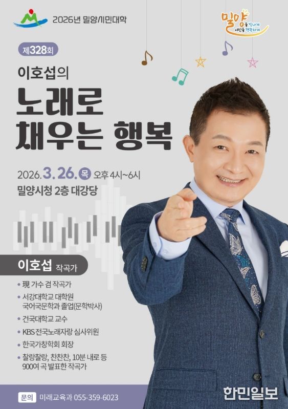 한민일보 서울포커스 김은금 기자 | 경남 밀양시는 오는 3월 26일 오후 4시 시청 대강당에서 제328회 밀양시민대학 강연을 개최한다. 이번 강연은 대한민국 대표 작곡가이자 방송인인 이호섭 씨를 초청해 ‘노래로 채우는 행복’이라는 주제로 진행된다.